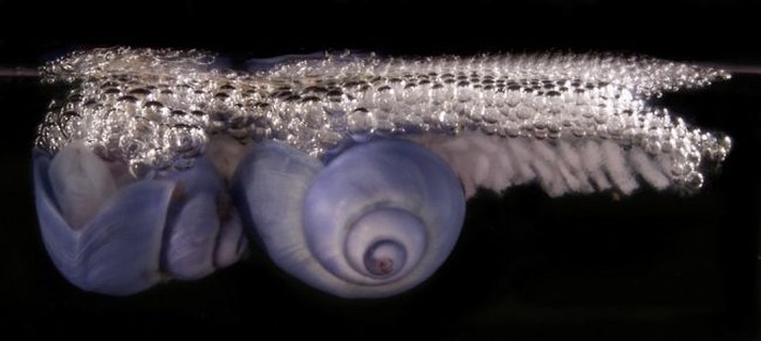 Kalau yang ini jenis bubble-rafting violet Janthina janthina. Siput ini mengeluarkan lendir dari kakinya dan menggunakan gelembung untuk mengapung dari satu tempat ke tempat lain. Foto: Denis Riek via Livescience