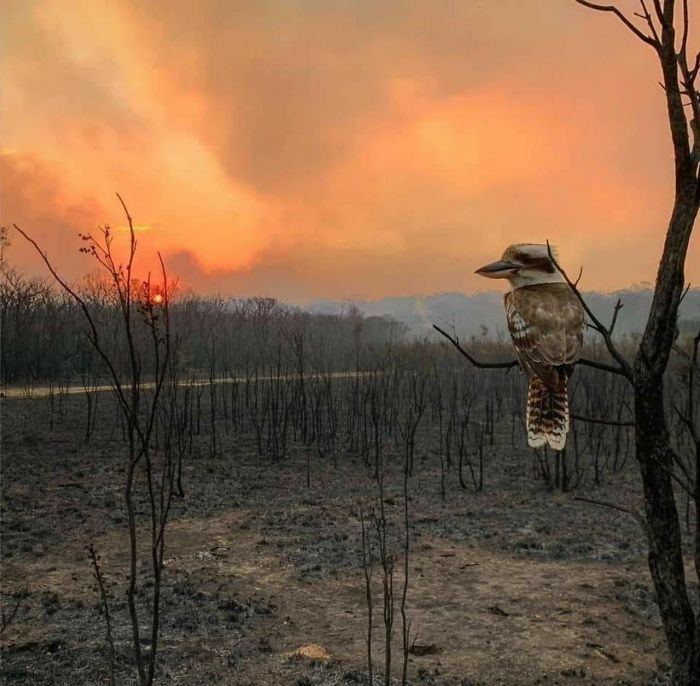 Seekor burung Kookaburra melihat padang luas usai terlalap api. Foto: Bored Panda