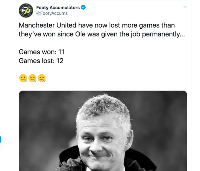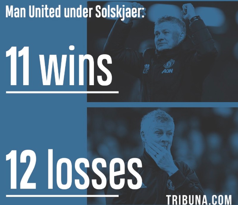 Manajer MU, Ole Gunnar Solskjaer, tentu yang paling disorot. Sejak permanen melatih MU, ia 11 kali menang tapi sudah 12 kali tumbang. Foto: Twitter