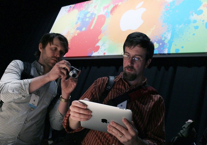 Jurnalis menjajal langsung iPad usai peluncuran yang berlangsung di Yerba Buena Center for the Arts, San Francisco, AS. Foto: Justin Sullivan/Getty Images