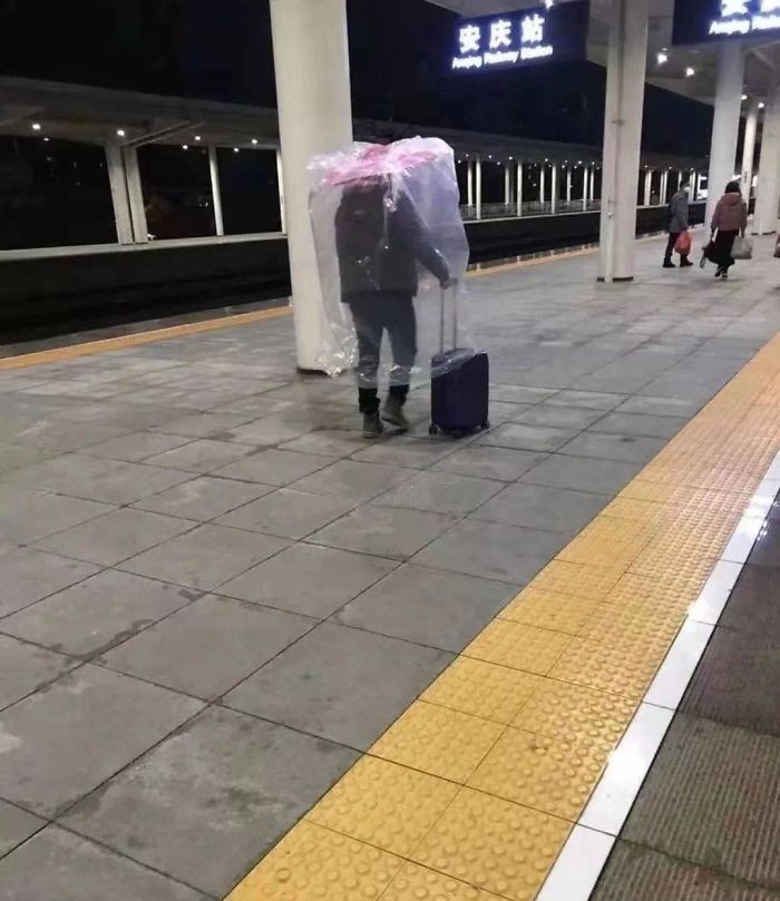 Agar aman bepergian, sekujur badan ditutupi oleh tudung plastik seperti ini.Β Foto: via Bored Panda