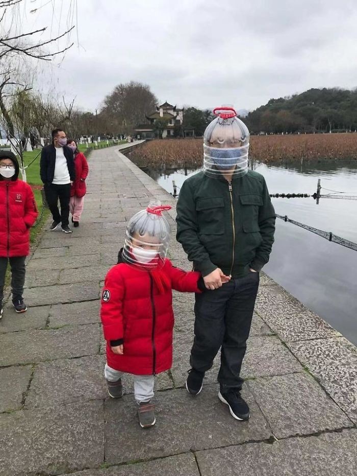 Tak cuma memakai masker, ibu dan si anak menggunakan bekas galon kecil yang sudah dipotong untuk melindungi kepala mereka.Β Foto: via Bored Panda