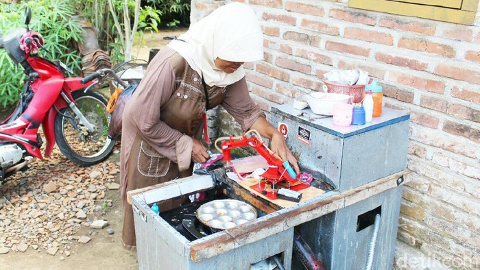 Praptining Utami (55) sudah berjualan telur dadar mini selama 1,5 tahun. Dia merasa terbantu dengan robot buatan putra bungsunya itu. (Rinto Heksantoro/detikcom)