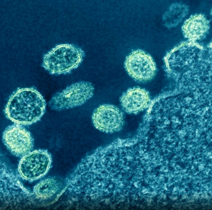 Mikrograf partikel virus corona Middle East Respiratory Syndrome (MERS) yang melekat pada permukaan sel VERO E6 yang terinfeksi. Foto: NIAID via Weather.com
