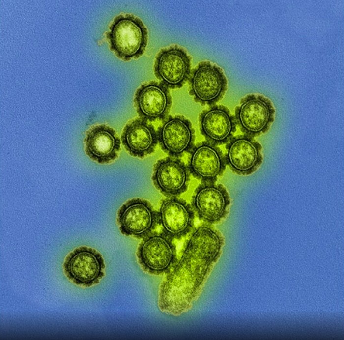 Mikrograf berwarna menunjukkan partikel virus influenza H1N1 atau Flu Babi. Permukaan protein pada partikel virus ditampilkan dalam warna hitam. Foto: NIAID via Weather.com