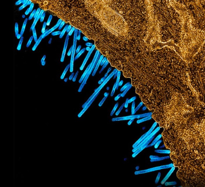 Mikrograf berwarna dari partikel virus influenza SW31 (biru) yang melekat dan bertunas dari permukaan sel MDCK (oranye). Gambar diambil dan ditingkatkan warnanya di NIAID Integrated Research Facility in Fort Detrick, Maryland, AS. Foto: NIAID via Weather.com