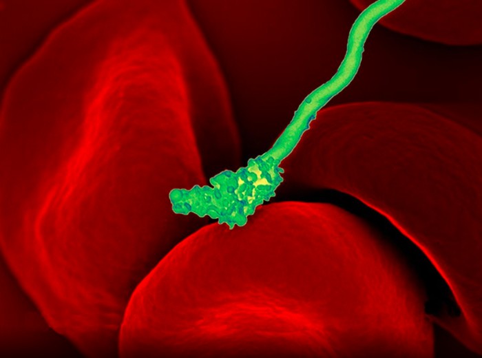 Mikrograf Borrelia hermsii yang menjadi penyebab demam kambuhan. Pada foto ini, Borrelia hermsii tampak berinteraksi dengan sel darah merah. Foto: NIAID via Weather.com
