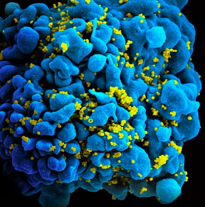 Sel T H9 yang terinfeksi HIV. Mikrograf dari partikel HIV yang menginfeksi sel T H9 manusia, berwarna biru, turqoise, dan kuning. Foto: NIAID via Weather.com