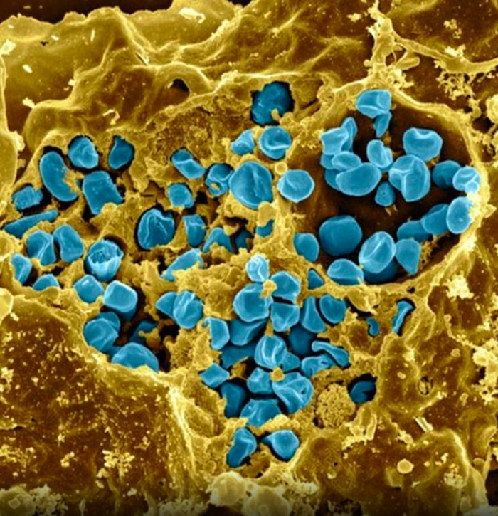 Interaksi MRSA (bakteri berwarna hijau) dengan sel putih manusia. Bakteri yang terlihat pada gambar ini adalah strain MRSA252, penyebab utama infeksi yang sering terjadi di Amerika Serikat dan Inggris. Foto: NIAID via Weather.com