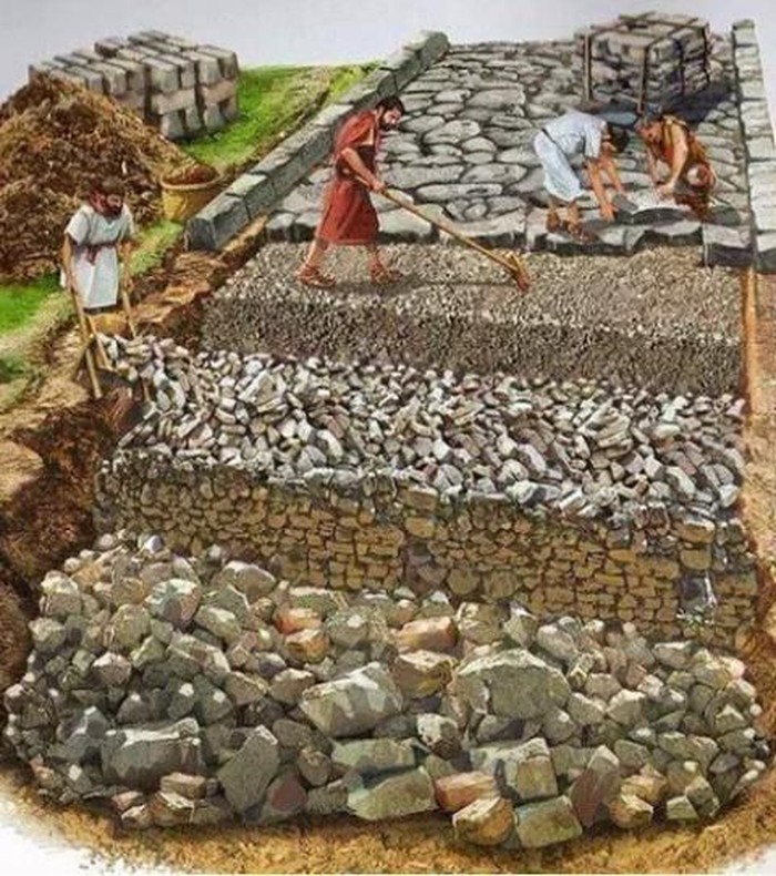 Beginilah cara membangun jalan di Roma, Italia pada masa kuno. Batu, kerikil dan pasir ditambahkan ke campuran pasir dan batu kapur. Foto: Pinterest via Gent Side