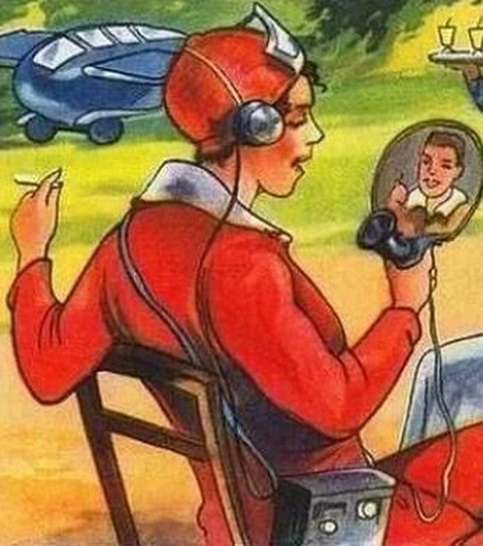 Para desainer kreatif di Prancis pada 1924 membayangkan seperti apa teknologi masa depan. Salah satunya adalah bagaimana kita bisa berbicara dari jarak jauh sambil bertatap muka, Nyatanya, sekarang kita bisa video call. Foto: Pinterest via Gent Side