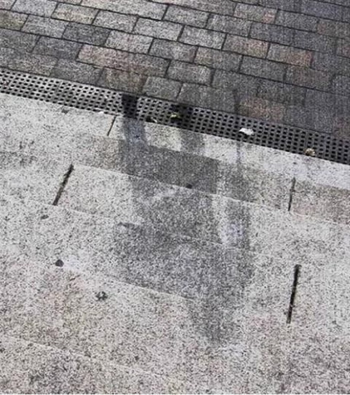 Setelah terjadi ledakan bom atom di Hiroshima, Jepang, ada bayangan manusia membekas di tanah. Tubuh tersebut 'melindungi' jalan beton yang terkena radiasi dari bom sehingga menciptakan efek bayangan ini. Foto: Pinterest via Gent Side