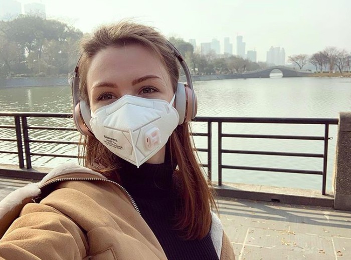 Anastasiya bermasker saat pose di salah satu sudut kota Wuhan yang sekarang sangat sepi. Foto: Instagram