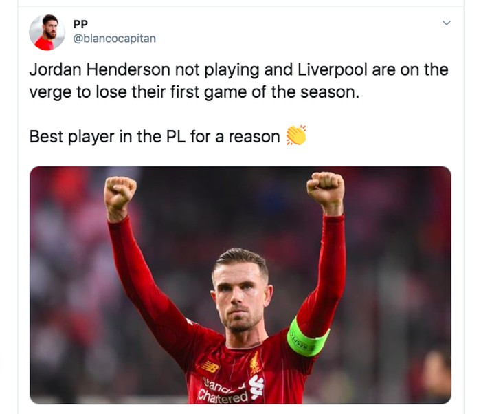 Menurut cuitan ini, Jordan Henderson adalah peain utama, mesin Liverpool. Dia bermain maka Liverpool celan sheet. Dia tak ada maka Liverpool banyak kebobolan. Foto: istimewa