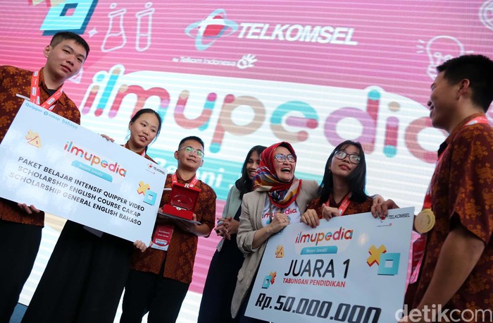 Vice President Mass Market Telkomsel Hastining B. Astuti (tengah) bersama para finalis Ilmupedia Berani Jawab (IBJ) usai pengumuman pemenang dalam babak Grand Final IBJ di Jakarta, Kamis (5/3). Setelah melewati dua babak eliminasi yang dilakukan secara online, kedua belas sekolah yang berhasil masuk ke dalam Top 12, mereka pun saling adu kepintaran dalam babak Grand Final IBJ yang diselenggarakan di Telkomsel Smart Office, Jakarta, pada 5 Maret 2020.