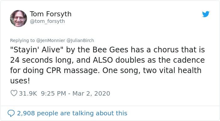 Selain buat cuci tangan, lagu Bee Gees ini terkenal banget buat Cardiopulmonary resuscitation (CPR). Foto: Twitter via Bored Panda