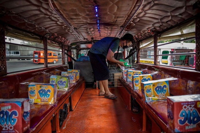 Supir Jeepney, Federico Tiozen Jr berinteraksi dengan seorang penumpang mengenakan sarung tangan untuk mencegah COVID-19. Foto ini diambil 16 Maret 2020 di Manila, Filipina. Foto: Getty Images