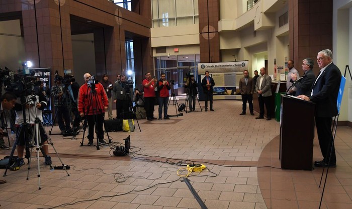 Gubernur Nevada, Steve Sisolak melakukan pertemuan dengan media dengan syarat jarak enam kaki atau hampir 2 meter untuk social distancing. Foto: Getty Images