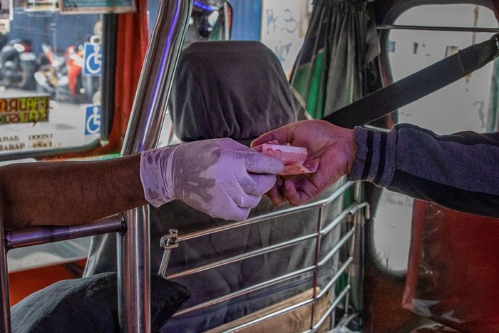 Tak hanya memakai sarung tangan, ia juga memberi sekat untuk tempat duduk penumpangnya. Foto: Getty Images