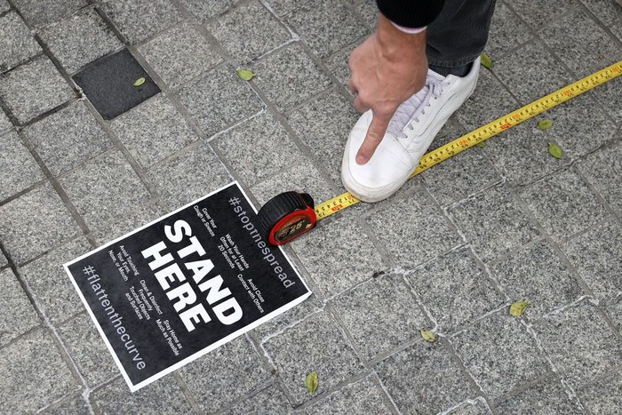 Seorang pekerja mengukur jarak antrian di restoran Chef Jose Andres dalam respon pencegahan penularan COVId-19. Foto: Getty Images