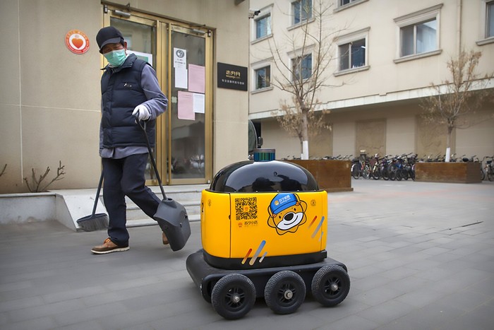 Ditengah gempuran COVID-19, teknologi China mengembangkan robot yang mampu membantu warganya seperti mengantar makanan hingga mengawasi mal. AP Photo/Mark Schiefelbein.