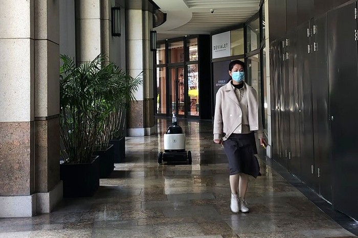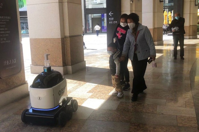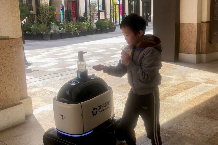 Robot ini juga membagikan hand sanitizer kepada warga yang melintas. AP Photo.