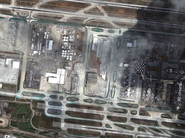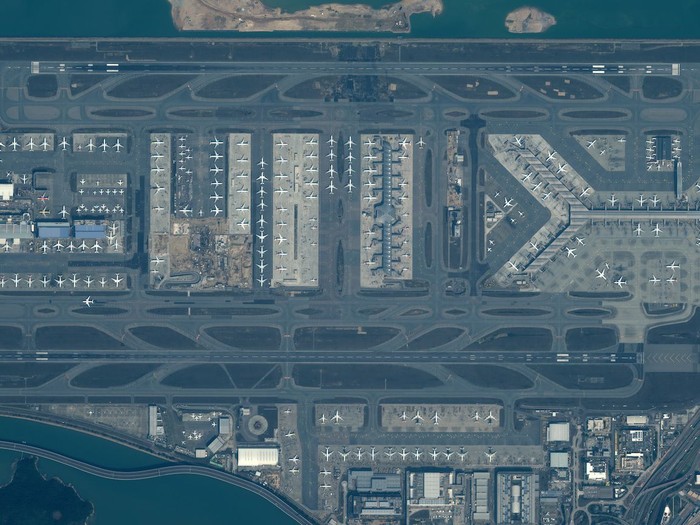Banyak pesawat yang parkit tidak beroperasi di Bandara Internasional Hong Kong, 17 Februari 2020.Β Foto: Maxar Technologies