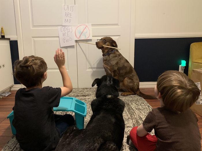 Haduh, akibat kegabutan, si anjing ini malah jadi 'guru' untuk mengatakan kalau dia yang terbaik dibandingkan si kucing. Haha, ada-ada saja. Foto: kmascasa via Bored Panda