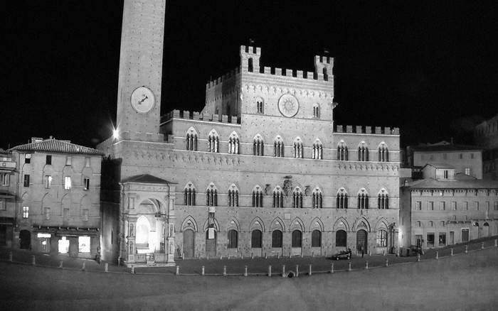 Seorang penduduk setempat membawa kedua anjingnya untuk berjalan-jalan malam di Scacchi Square, yang dikenal karena set catur besarnya, dengan Kastil Marostica di latar belakang. Provinsi Vicenza, Foto: Milan Radisics via behance