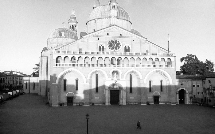 Tampak satu orang yang tengah melintasi alun-alun di depan Basilika Sant'Antonio, Kota Padua, Italia Foto: Milan Radisics via behance