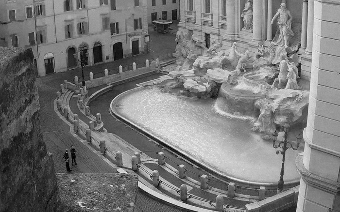 Terlihat petugas polisi yang mengenakan masker pelindung memandu seorang pejalan kaki di depan Air Mancur Trevi. Roma, Foto: Milan Radisics via behance