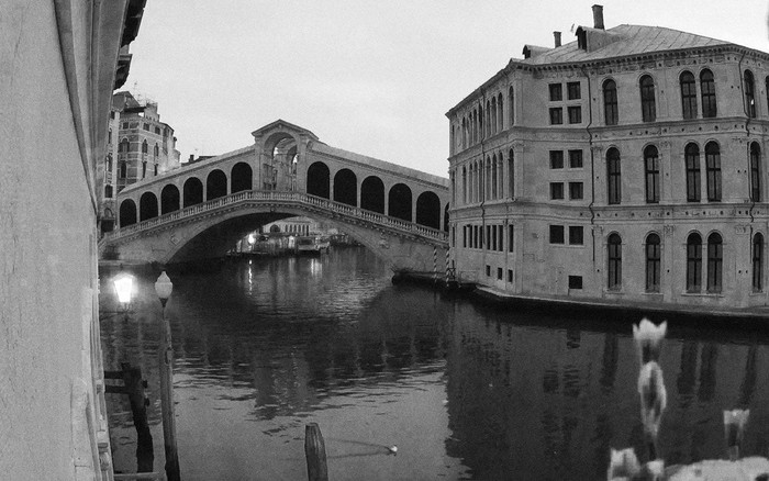 Burung camar berenang di Grand Channel yang tenang di depan Jembatan Rialto yang terkenal. Venesia. Foto: Milan Radisics via behance