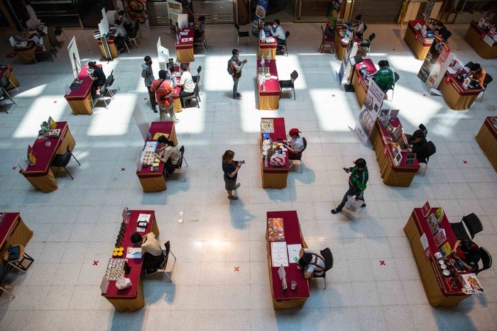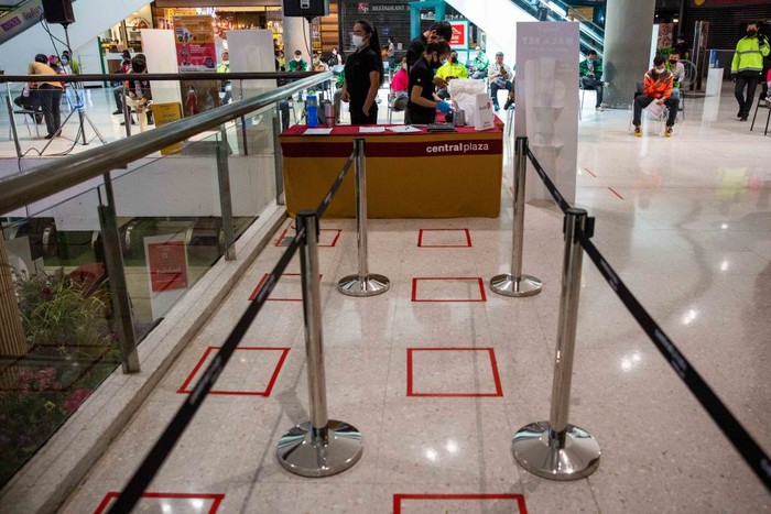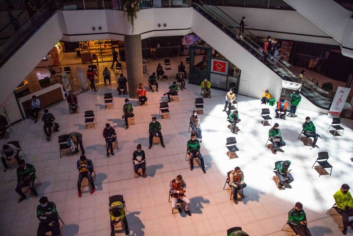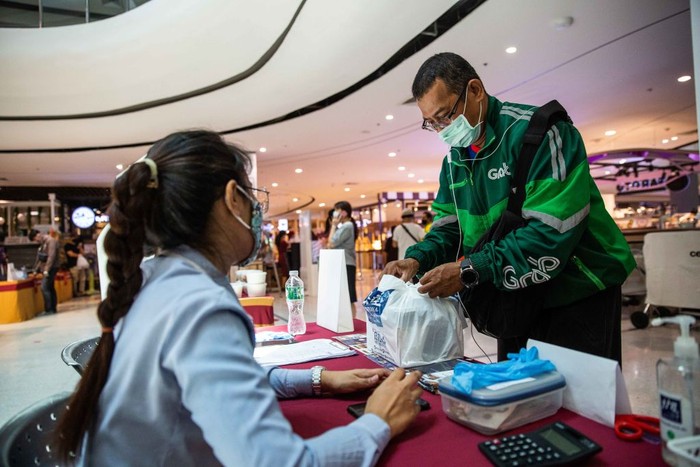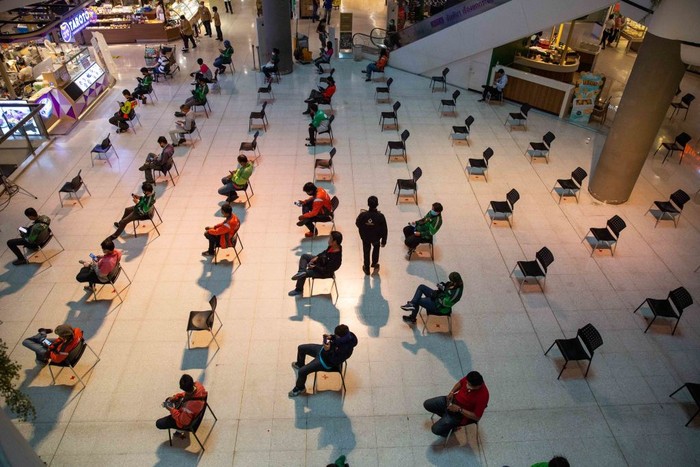Pengemudi pengiriman makanan menunggu untuk mengambil pesanan di kursi-kursi yang sudah diberikan jarak di Central Plaza Pinklao Mall, Bangkok, Thailand.