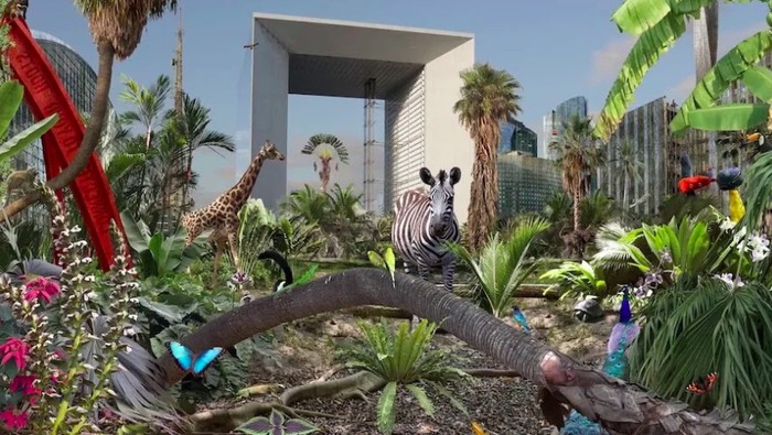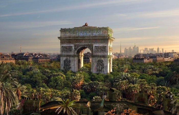 Singa sang raja hutan menjadikan L'Arc de Triomphe sebagai singgasananya. Mungkin seperti itulah jika kawasan ini berubah menjadi hutan. Foto: via Brainberries
