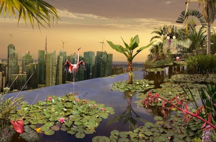 Flamingo, burung unta, dan satwa lainnya menghuni kota modern. Terlihat aneh, namun menambah sedikit kehijauan, danΒ hewan-hewan ini serasa seperti di rumah mereka. Foto: via Brainberries