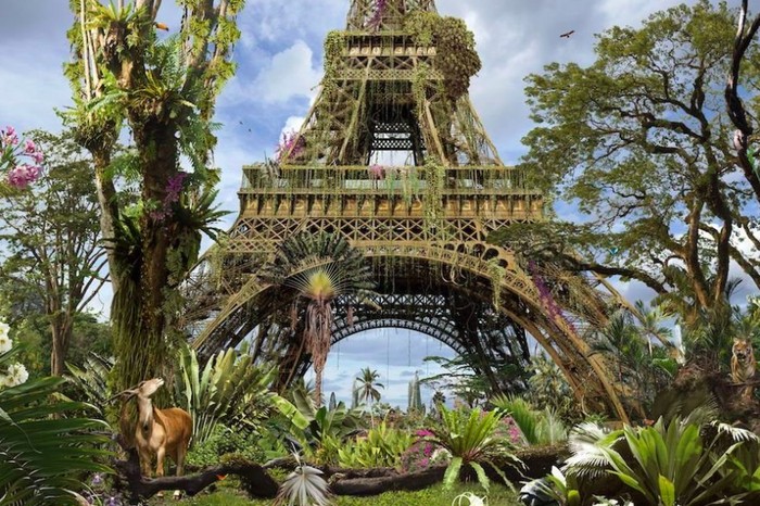 Seniman asal Prancis Chris Morin-Eitner berimajinasi jika kota tak dihuni manusia. Imajinasinya ini dituangkan dalam karya ilustrasi. Ini adalah imajinasinya tentang Menara Eiffel. Foto: via Brainberries