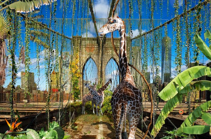 Jerapah diΒ jembatan Brooklyn seperti model yang berlenggak-lenggok. Foto: via Brainberries