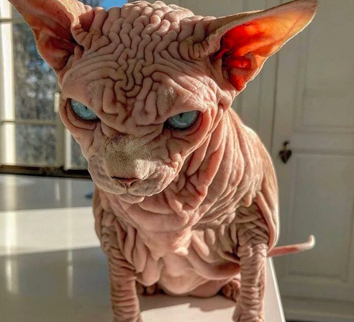 Jenis kucing tidak berbulu seperti Xherdan ada sebutannya, yaitu sphynx. Ada yang mulus, ada juga yang berlipat-lipat seperti Xherdan.Β Foto: Instagram @xherdanthenakedcat