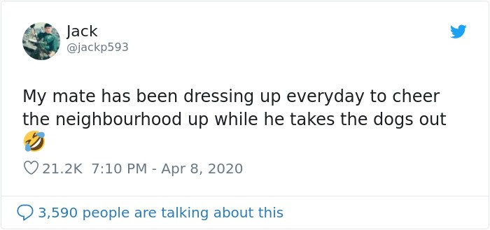 Akun @jackp593 bercerita tentang tetangganya yang berdandan aneh setiap hari sambil membawa anjingnya berkeliling komplek. Ini dilakukan untuk menghibur para tetangga agar tidak stres. Foto: jackp593 via Bored Panda