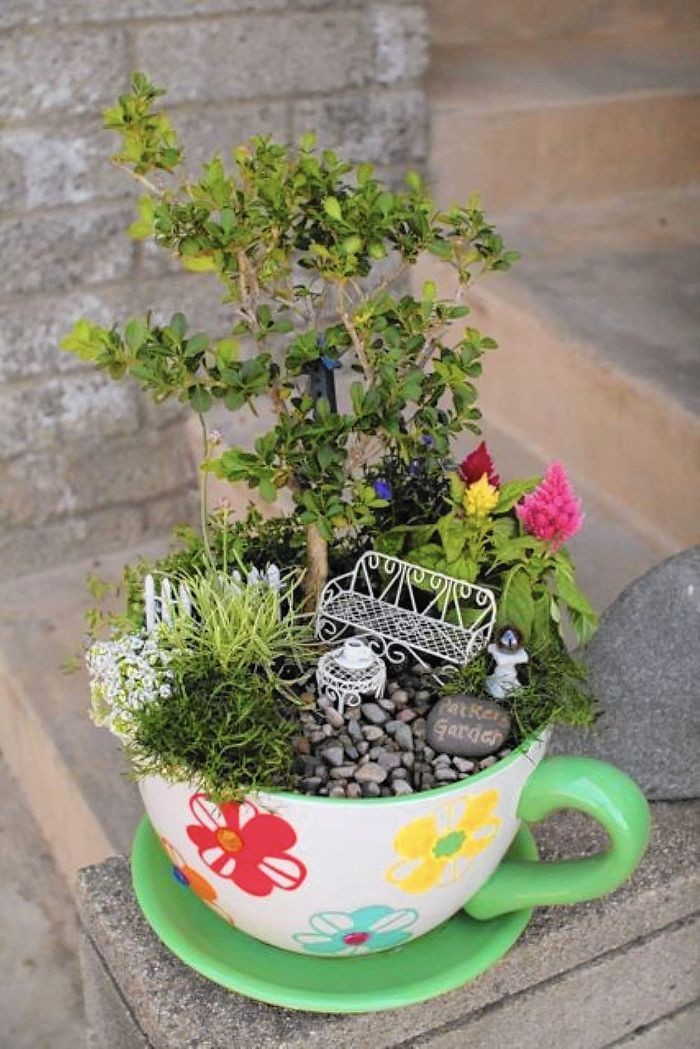 Tanaman yang merambat dari teko seakan menjadi air yang mengaliri taman.