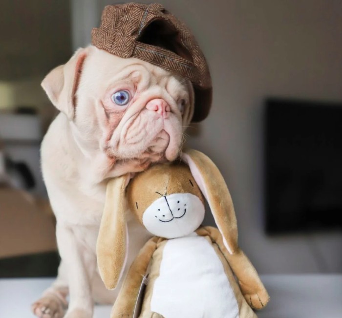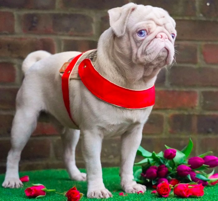 Penampilannya yang seperti albino adalah hasil dari defisiensi pigmen yang diwariskan.Β Foto: Instagram @milkshakethepug via Brainberries