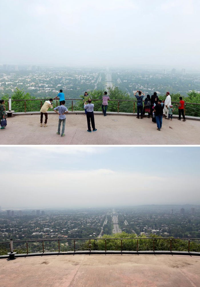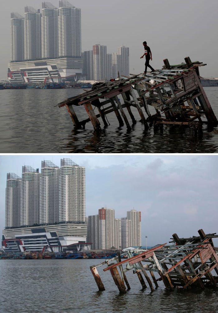 Potret kota Jakarta, Indonesia. Foto di atas diambil pada 4 Juli 2019, sedangkah di bawah pada 16 April 2020. (Foto: Boredpanda)