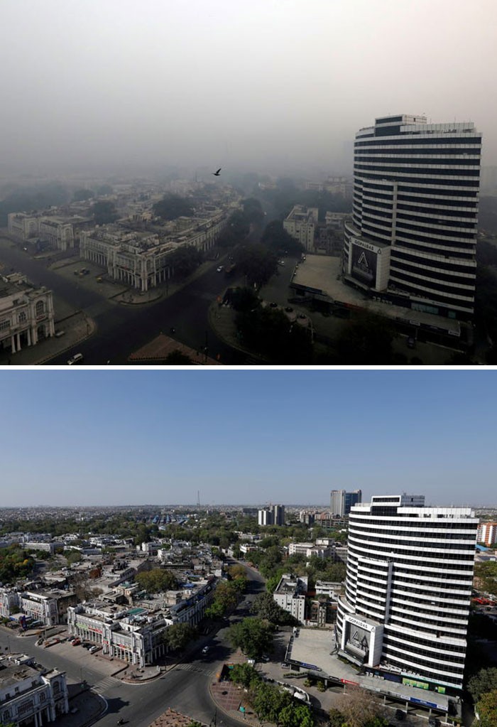 Potret gedung dari atas di kota India, sebelumnya tampak polusi yang pekat diambil pada tanggal 8 November 2018. Setelahnya diambil pada 8 April 2020. (Foto: Boredpanda)