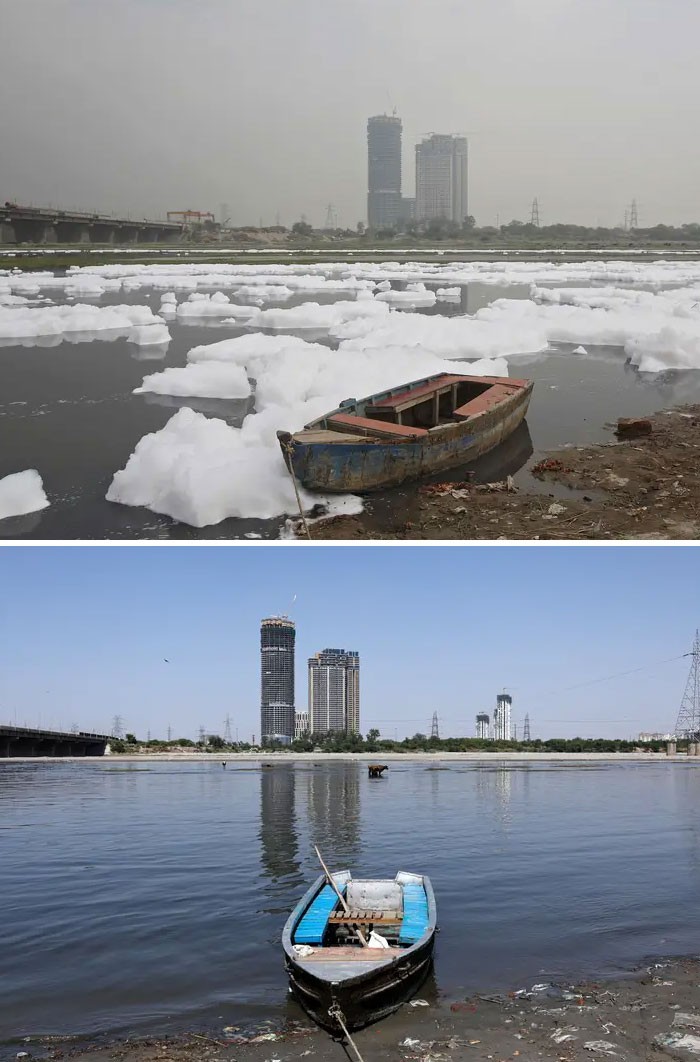 Pada tahun lalu, India kembali menduduki puncak dengan tempat paling tercemar di dunia. Ini adalah potre Sungai Yamuna di New Delhi, India pada gambar atas diambil padang tanggal 21 Maret 2018, sedangkan foto bawah pada 8 April 2020. (Foto: Boredpanda)