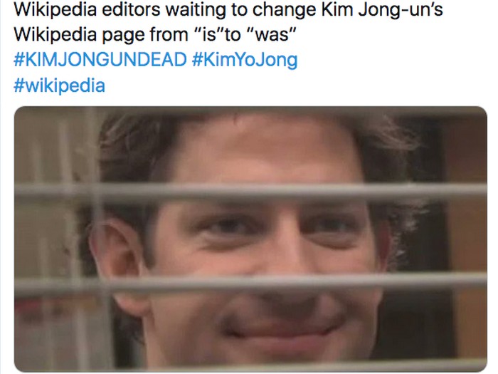 Editor Wikipedia seperti menunggu-nunggu kabar kepastian kondisi Kim Jong Un, benar meninggal atau tidak. Karena nanti mereka harus mengupdate informasinya (Twitter)