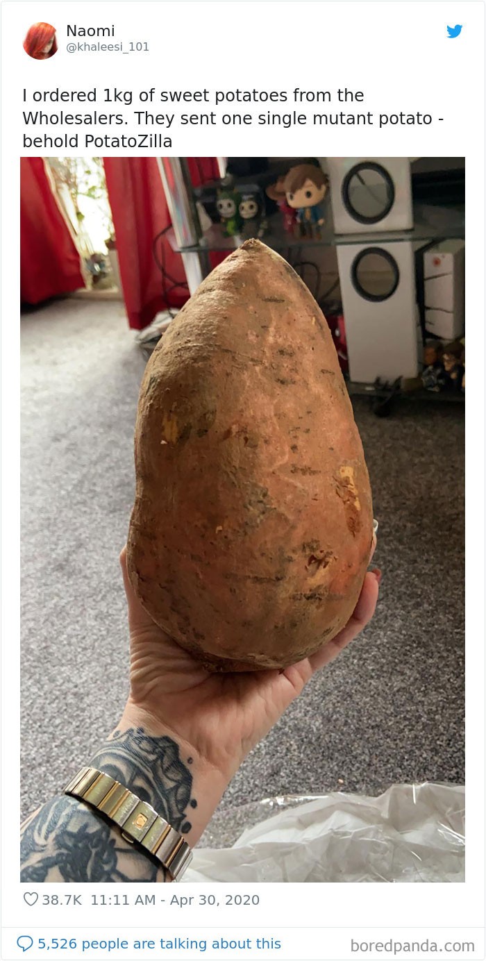 Ketika membeli 1kg kentang, ternyata orang ini hanya diberikan satu buah kentang seberat 1kg.