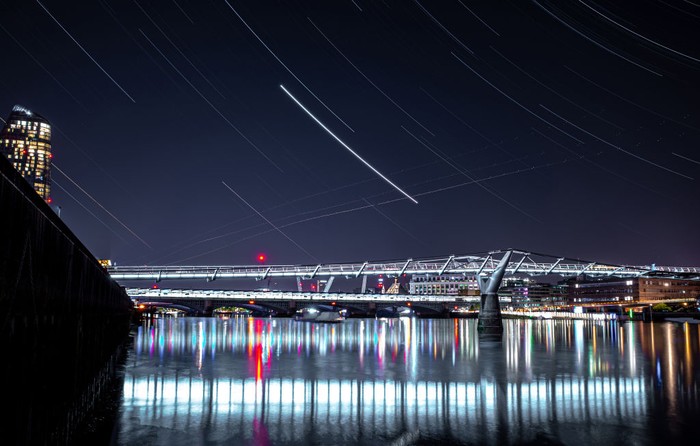 Ini adalah hujan meteor Lyrid di London Millennium Footbridge yang terlihat sangat indah diterangi cahaya bintang-bintang pada malam yang cerah (21/4/2020) di London, Inggris. (Simon Robling/Getty Images)