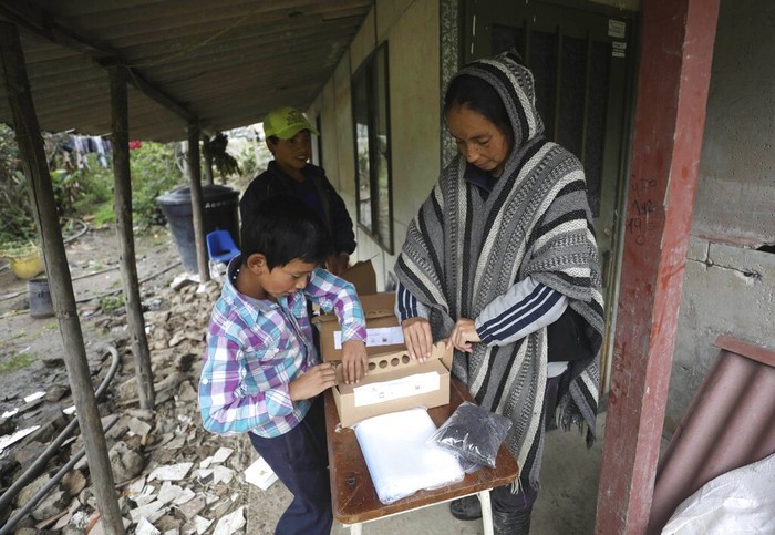 Nubia Rocio Gaona (37) bersama kedua putranya, David (14) dan Alejandro (9) sedang merekam kegiatan mereka melalui kamera ponsel di pekarangan rumah mereka di Chipaque, Kolombia, Sabtu (9/5).