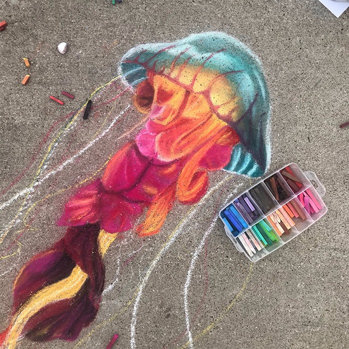 Tapi bukan berarti ibu dan anak ini berhenti berkarya, mereka menuangkan kreativitas mereka di atas trotoar. Foto: Instagram/@janrigginsart