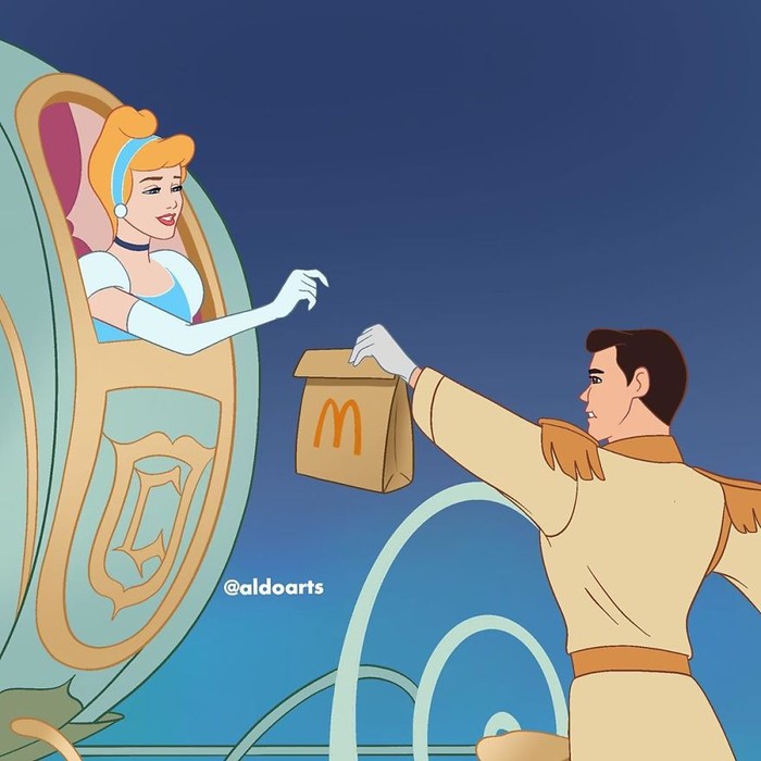 Pangeran rela delivery makanan buat Cinderela supaya gak perlu ke mana-mana. Foto: @aldoarts via Bored Panda